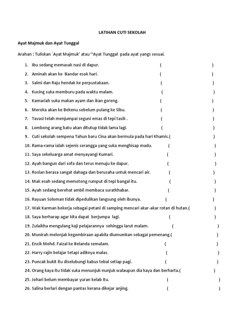 1.peserta yang pengsan itu bernama sulaiman. Baca versi flipbook dari nota dan latihan ayat tunggal . Unit 1 keluarga bahagia sistem bahasa by erwan308. Latihan ayat tunggal dan ayat majmuk. Ayat tunggal dan ayat majmuk exercise . Latihan pengukuhan pjpk tingkatan 1.